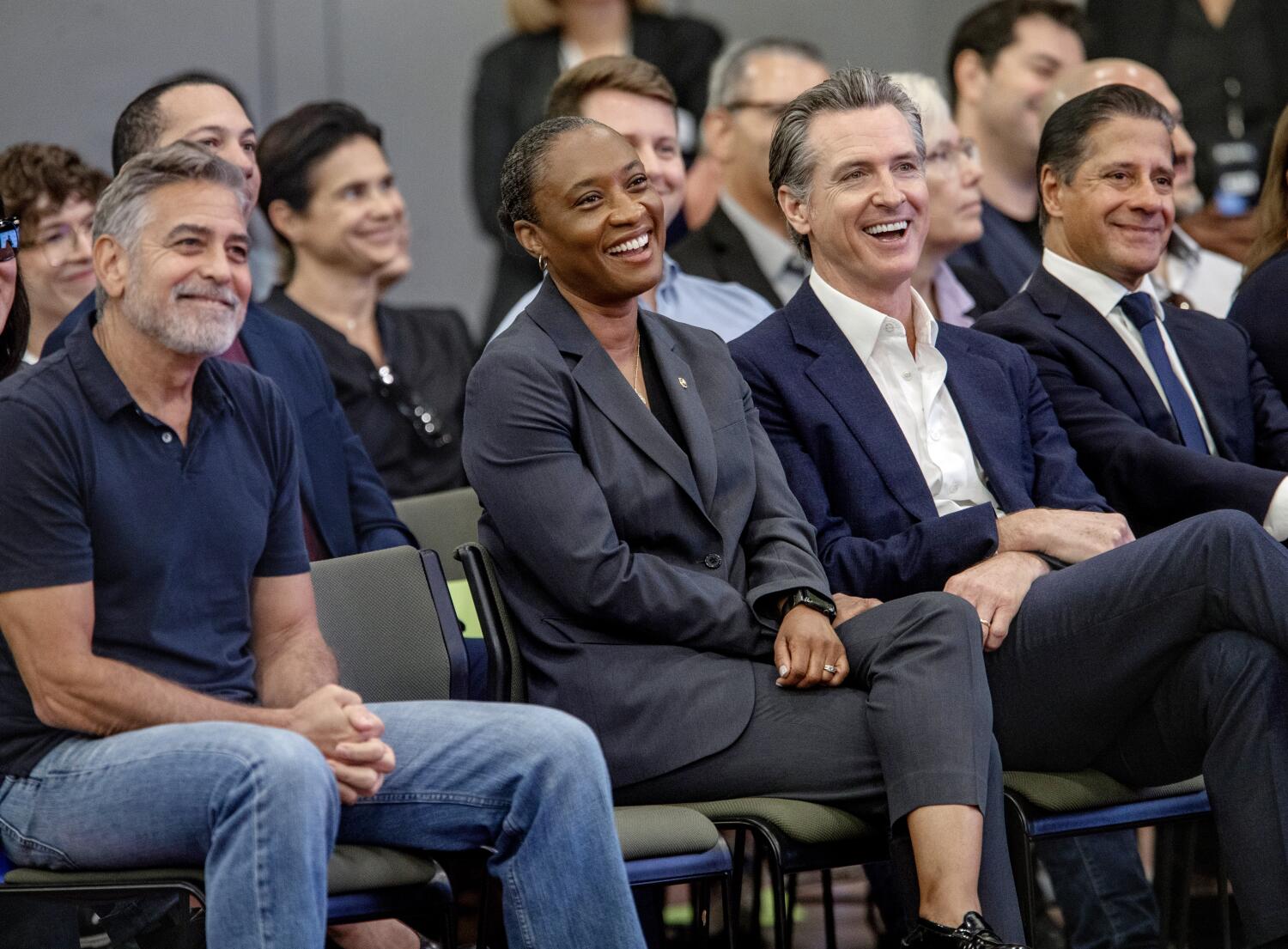 The celebration of a film and television production magnet school in downtown Los Angeles had the feeling of a campaign rally. Celebrities George Clooney and Eva Longoria and politicians including Gov. Gavin Newsom mingled with fans before taking the stage. There in the middle of it all was California’s newest senator, Laphonza Butler.
